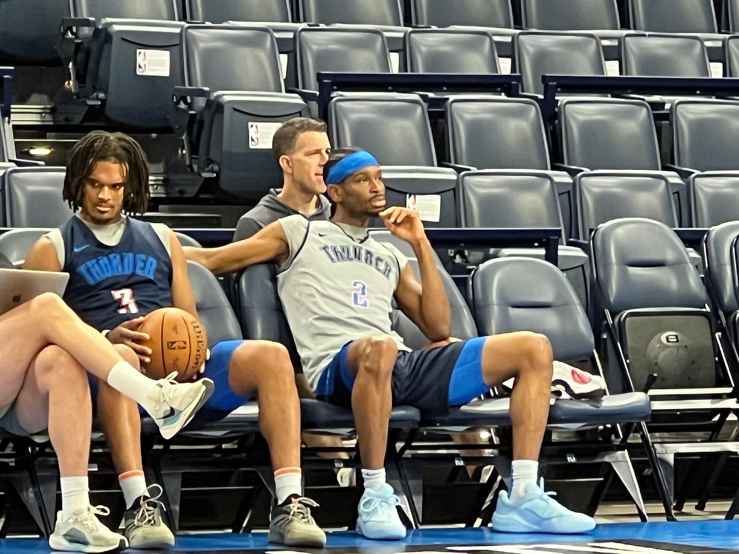 The Thunder weren’t at full strength — without Alex Caruso (concussion), Isaiah Joe (left knee contusion), Cason Wallace (left knee sprain), Jalen Williams (right wrist rehab), and Kenrich Williams (left knee rehab).