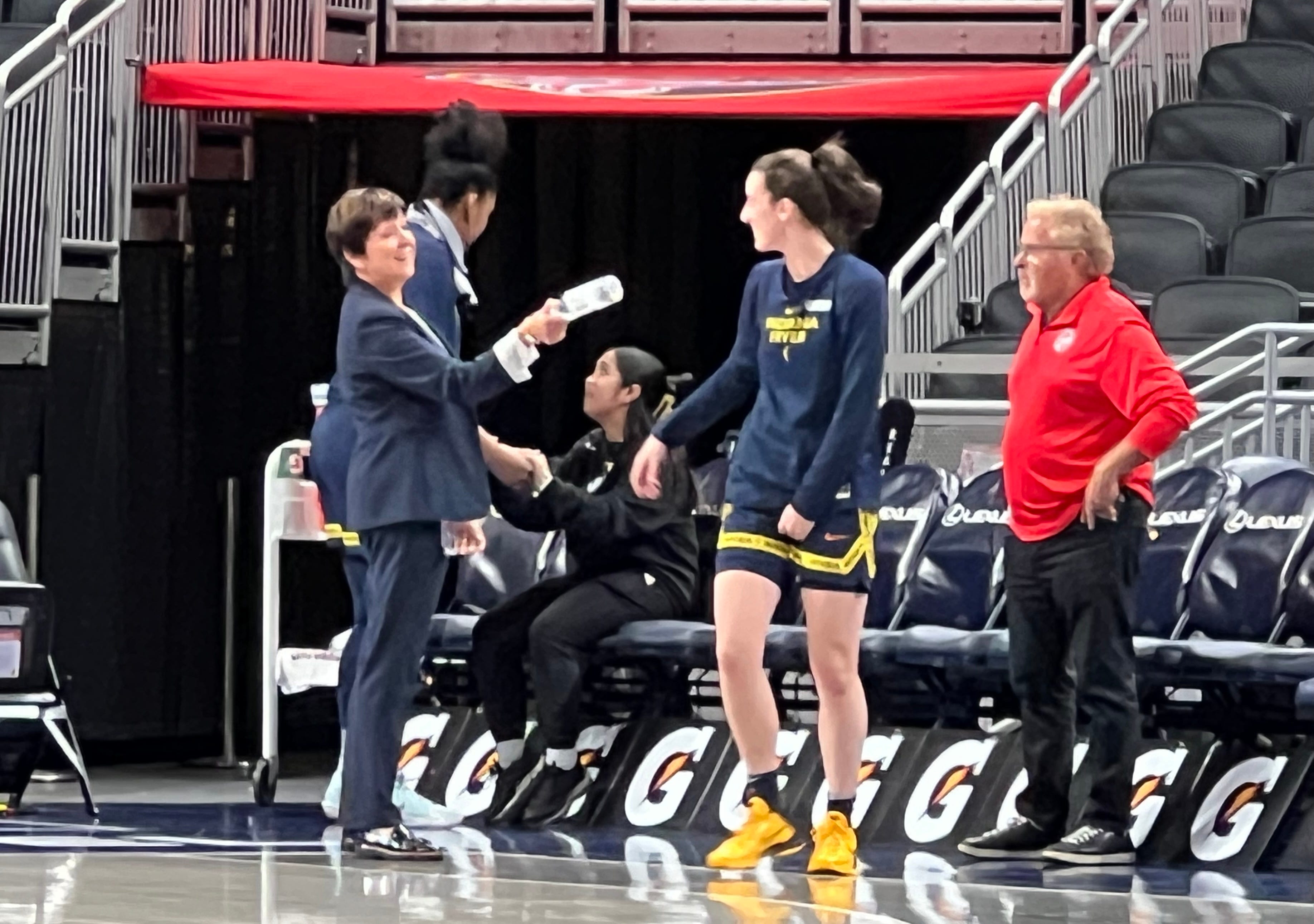 Barber was at morning shootaround on Wednesday and hugged players as they stepped onto the court (like Caitlin Clark in the photo above).