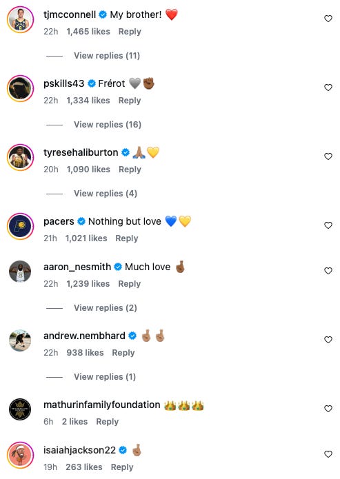Also, I think it’s worth sharing a sample of replies from their teammates. This was Mathurin’s post, but the same was true for Jackson.