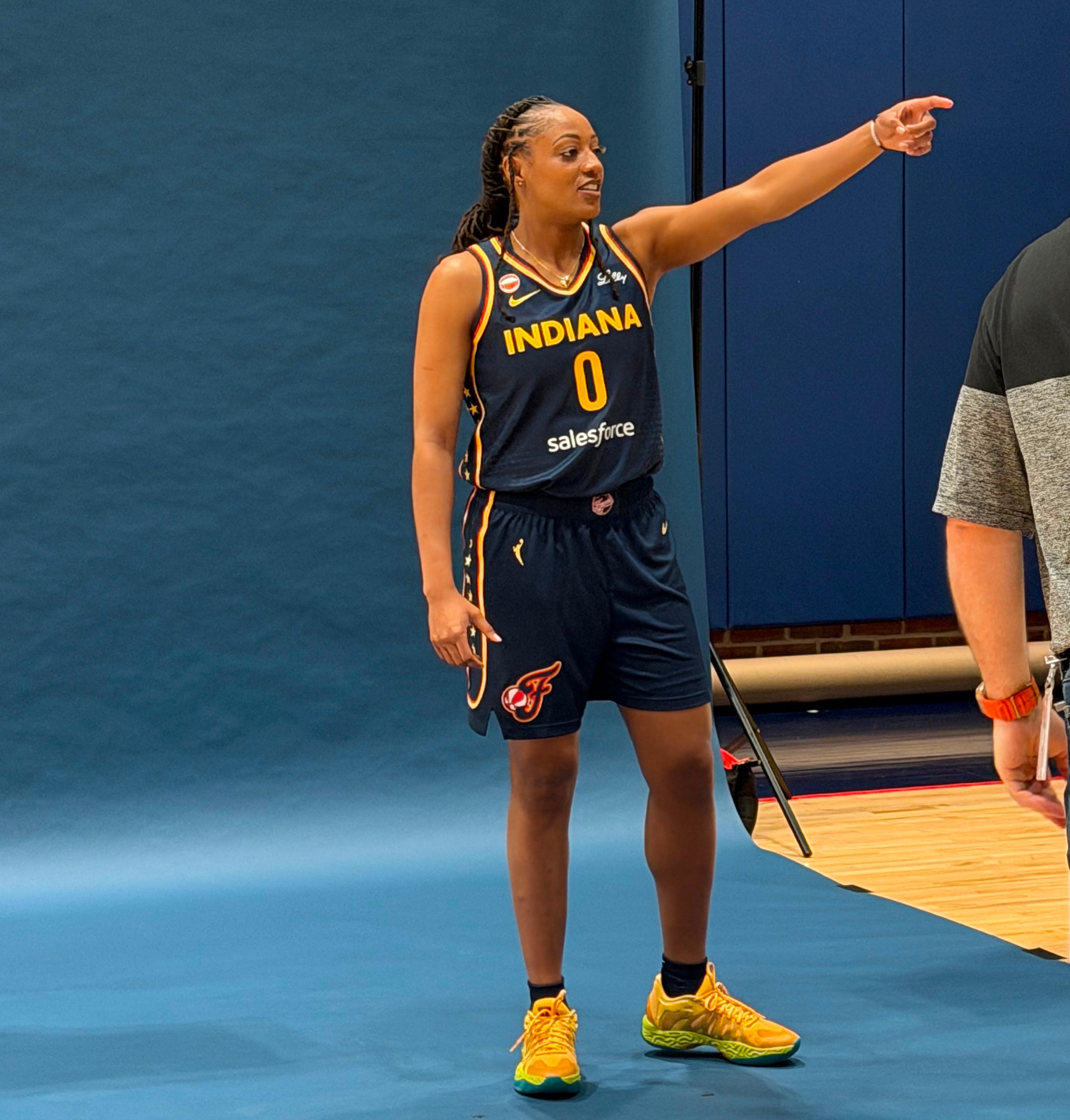 Kelsey Mitchell, sneaker free agent, wears Hali 1s at Fever Media Day