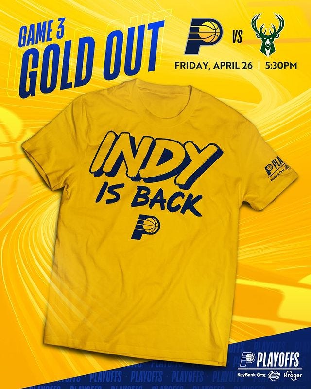 Fans at Gainbridge Fieldhouse will receive a gold t-shirt a Friday's game as the Indiana Pacers host the Milwaukee Bucks for Game 3 of their first-round series.