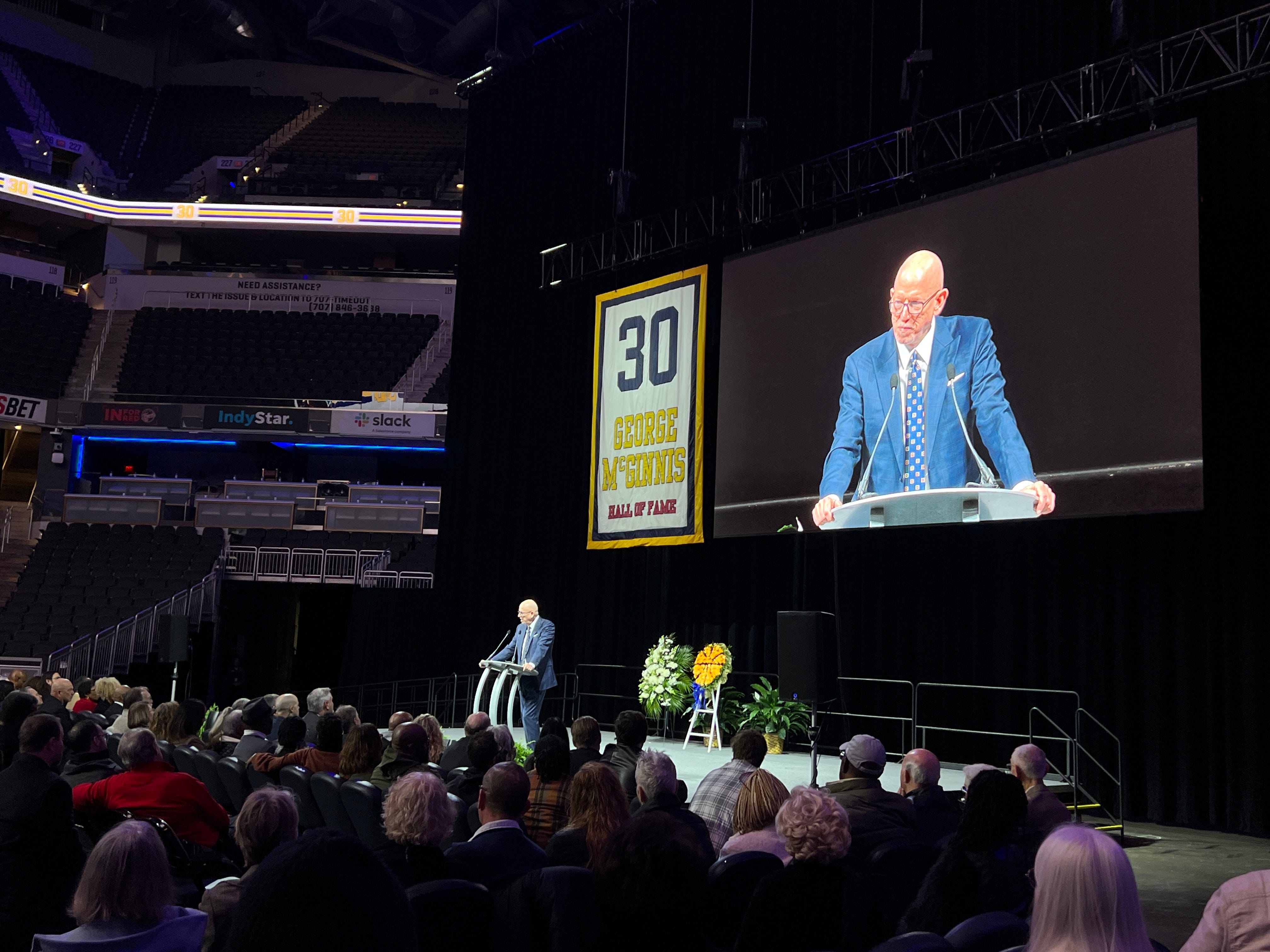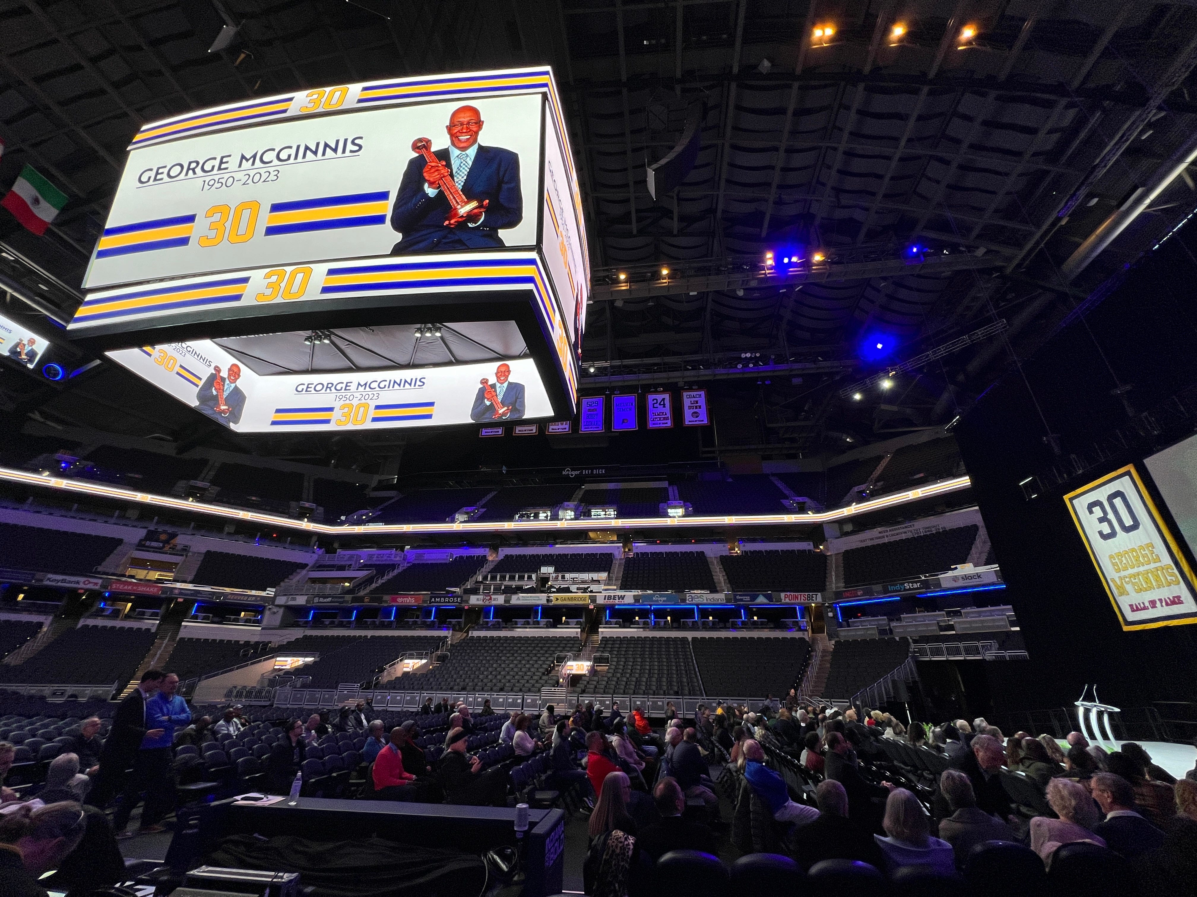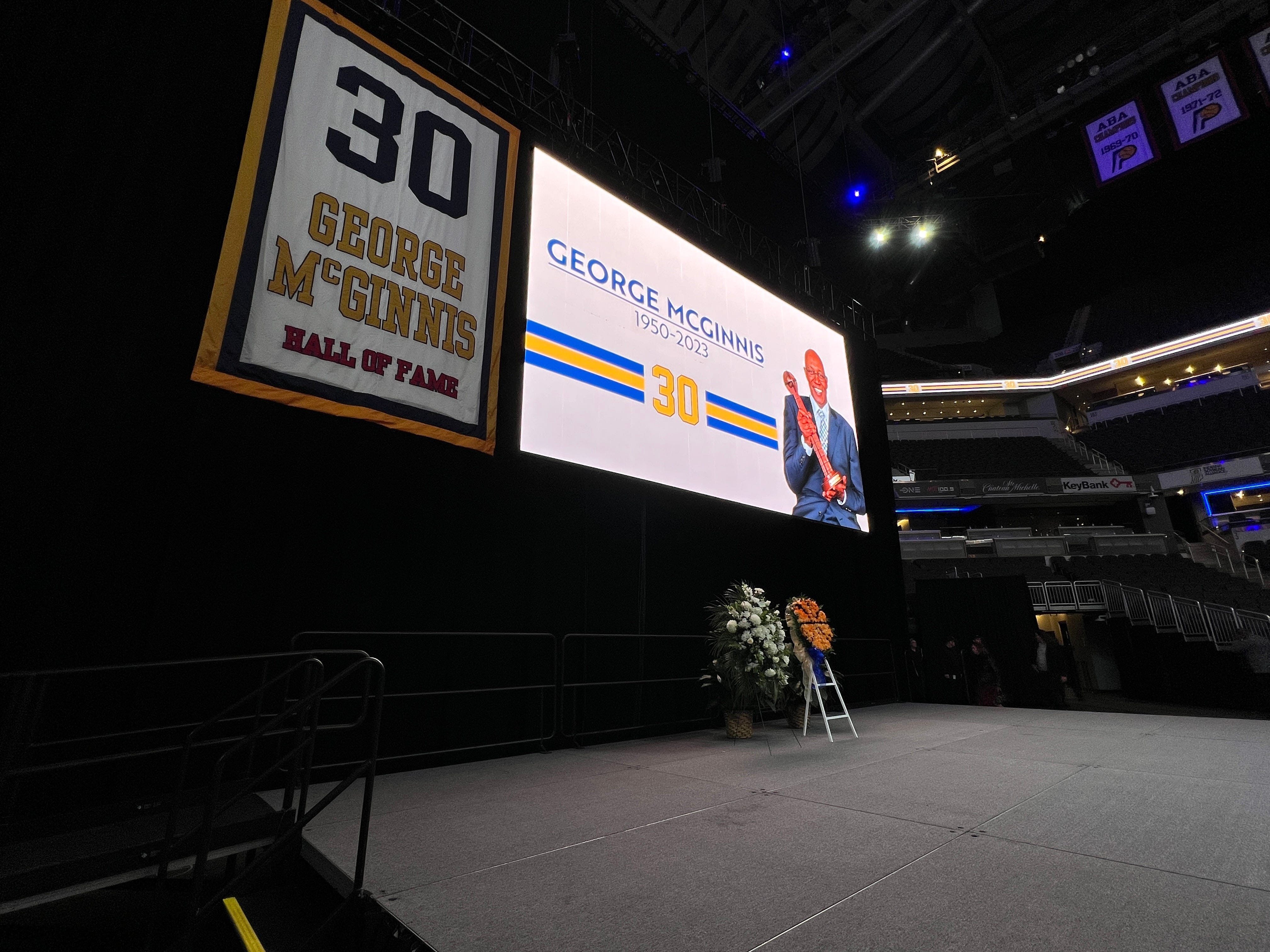 The lights were dim and the giant video board overhead had a photo of George McGinnis with his Naismith Memorial Basketball Hall of Fame trophy, along with his number: 30. The Indy native and Pacers great passed away on Dec. 14 at the age of 73.
